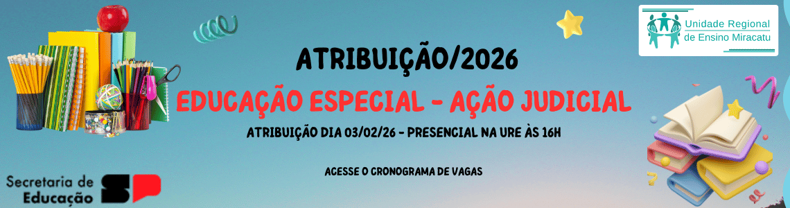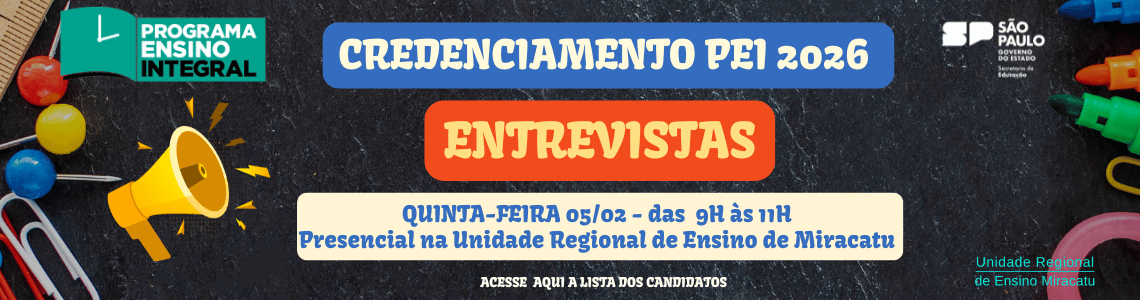 - CREDENCIAMENTO PEI/2026 – FASE ENTREVISTA – DIA 05/02/2026A Unidade Regional de Ensino – Região de Miracatu convoca os candidatos que já iniciaram o … Leia mais »