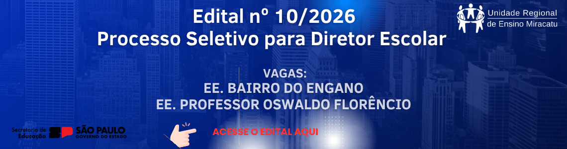 - PROCESSO SELETIVO PARA DIRETOR ESCOLAR EDITAL Nº 10/2026 PROCESSO SELETIVO PARA DESIGNAÇÃO …O Dirigente da Unidade Regional de Ensino – URE, Região de Miracatu, da Secretaria da Educação … Leia mais »