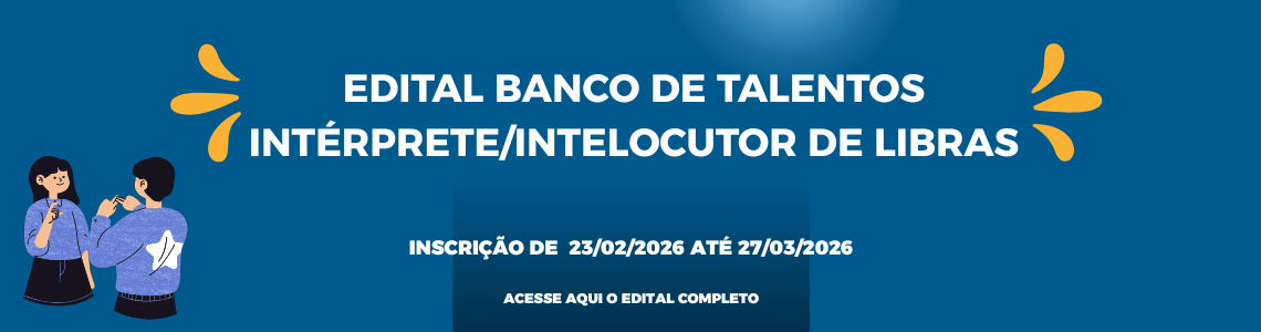 - EDITAL BANCO DE TALENTOS INTÉRPRETE/INTELOCUTOR DE LIBRASA Secretaria da Educação do Estado de São Paulo – SEDUC-SP, torna pública a abertura de … Leia mais »