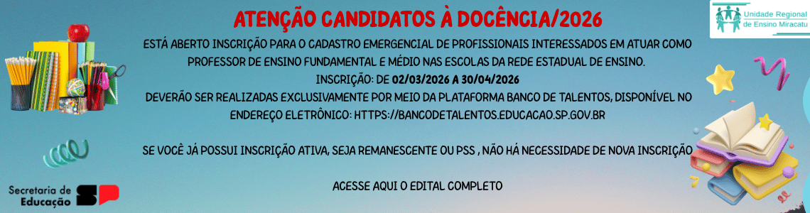 - PORTARIA DA CHEFE DE DEPARTAMENTO PORT. GAB – 13/2026A Chefe de Departamento da Unidade Regional de Ensino de Miracatu, nos termos da Resolução SEDUC 01/2026 torna público o … Leia mais »